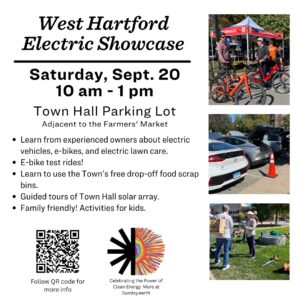 Join us in West Hartford on Sunday October 6, 2024 from 10 AM to 1 PM to learn more about electric vehicles, e-bikes, electric lawn care and more.